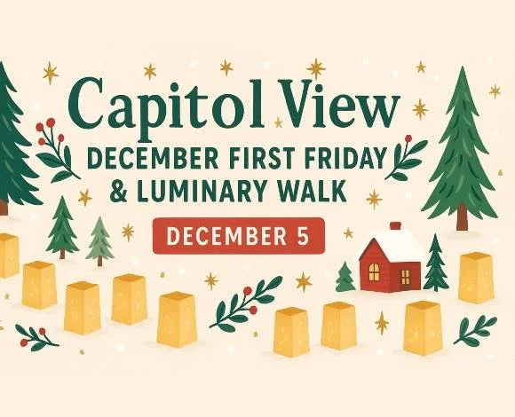 This year, Capitol View Neighborhood Association (CVNA) is bringing a little extra glow to December’s First Friday with a short, luminary-lit walk between two houses to kick off the holiday season together on Friday, December 5th, at 6 pm.